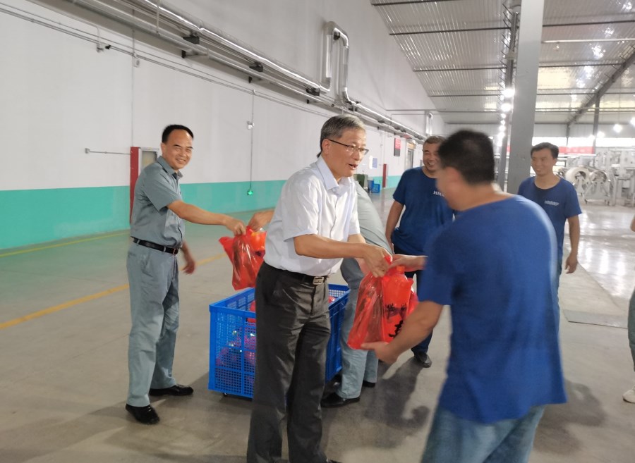 立秋以來,氣溫不降反升,天氣持續(xù)高溫酷熱,安徽華茂各單位生產一線的員工都奮戰(zhàn)在崗位上,戰(zhàn)高溫、保質量、奪高產。8月20日,市政府副秘書長李文勝在市總工會副主席徐玲華的陪同下,來到華欣公司慰問堅守在一線的員工,并送上防暑降溫物品。