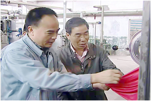 華茂集團董事長倪俊龍與武漢紡織大學教授徐衛(wèi)林在攻關現場