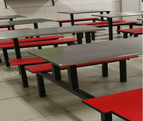 2、餐桌椅要求:四人座連體餐桌椅,不銹鋼桌面、防火板座椅(實物見照片)。